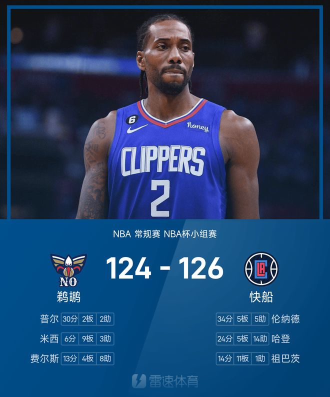 伦纳德中投绝杀鹈鹕,全场砍下34分5篮板5助攻,哈登贡献24分5篮板14助攻。